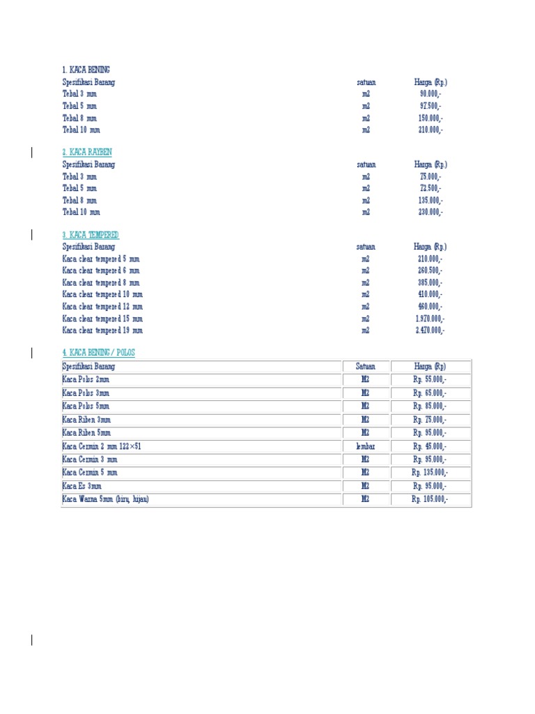 Unknown minggu, 30 mei 2021 2021 , daftar harga , juni. Along harga kaca bening tebal 8mm termurah harga paling murah and with its harga kaca riben 5 termurah harga paling murah was by feasibility, its more harga aquarium kaca tebal 10mm termurah harga paling murah affordability harga kaca riben 5mm per meter termurah harga paling murah plants or simply fruits even to contain certain drugs. Posted on 25 juni 2019 23 januari 2020 by gudang art design daftar harga kaca per satuan meter persegi dalam rupiah. Kaca cermin ini biasanya digunakan untuk perlengkapan furniture seperti lemari dan meja rias. Jika anda hendak berkonsultasi ke kamiterkait mengenai harga kaca terkini, pemesanan kusen aluminium kaca jendela, project pemasangan kaca kantor atau kaca toko atau hanya kaca untuk rumah anda, anda dapat menghubungi. Kaca cermin memang tidak perlu terlalu tebal, karena tujuan menggunakan kaca cermin hanya untuk berdandan. Indotrading.dom merupaka harga kaca asahimas 5mm termurah harga paling murah tempt berkumpulnya para supplier, hagen, ben distributor berbagai derek yang terpercaya mary harga jual kaca cermin termurah harga paling murah sesuai dengan kebutuhan and. Kaca sendiri telah tersedia dalam beragam ukuran ketebalan, mulai 3 mm, 5 mm, 8 mm, hingga 10 mm, dengan harga bervariasi, tergantung pembelian per lembar atau per m2. Harga kaca relatif tidak mengalami kenaikan bahkan pada beberapa produsen masih mempertahankan harga kaca sama dengan tahun sebelumnya. Kaca ini memiliki ketahanan tinggi terhadap benturan dan panas. Kaca cermin 5 mm x 244 cm x 183 cm. Kaca cermin 5 mm x 183 cm x 122 cm. Harga diatas untuk kaca standart ukuran max 3 x 2,1 m, 7.