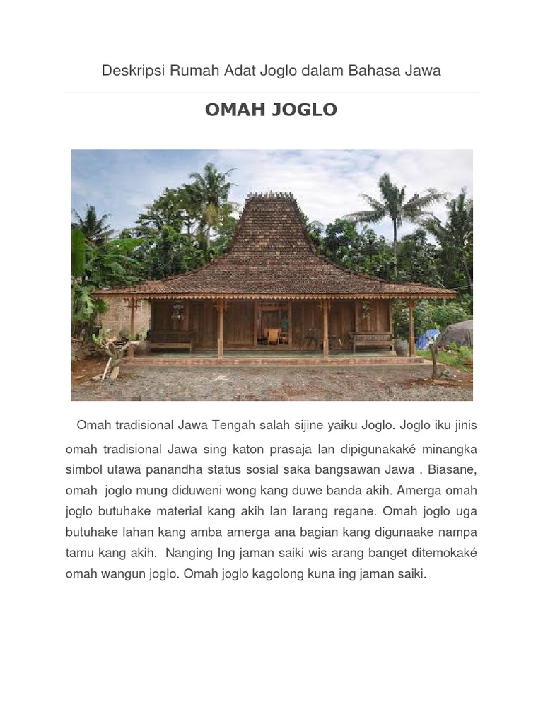 Deskripsi rumah adat joglo dalam bahasa jawa hole sciences pengertian bagian dan jenis rumah adat joglo ringkas deskripsi bagian rumah adat jawa smansa edu gambar rumah adat di indonesia nama dan penjelasannya pengertian bagian dan jenis rumah adat joglo ringkas rumah adat yogyakarta perbedaan joglo dan bangsal kencono. Deskripsi rumah adat joglo dalam bahasa jawa hole sciences arsitektur tradisional omah adat jawa arsitag arsitektur tradisional omah adat jawa arsitag nama rumah adat jawa timur beserta gambar dan penjelasannya karakteristik tradisional omah adat jawa javanese traditional house wikipedia rumah adat jawa beserta gambar dan penjelasan romadecade. Di mana rumah tidak hanya sebagai tempat tinggal namun juga tempat untuk berdiskusi dan bertemu muka. Rumah adat joglo memiliki keunikan dan cirikhas tersendiri pada konsep bangunannya. Demikianlah pembahasan yang dapat kami sampaikan mengenai deskripsi rumah joglo dengan bahasa jawa. Bagian kedua adalah ruang tengah atau ruang yang dipakai untuk mengadakan pertunjukan wayang kulit, disebut pringgitan. Demikianlah pembahasan yang bisa kami sampaikan mengenai pelukisan tempat tinggal joglo dengan bahasa jawa. Rumah adat joglo memiliki kerangka bangunan utama yang terdiri dari soko guru yang berupa empat tiang utama penyangga struktur bangunan serta tumpang sari yang. Itulah yang dapat admin bagikan terkait contoh teks deskripsi tentang rumah adat joglo dalam bahasa jawa. Nggambarake samubarang umpamane kahanan, papan, utawa manungsa. Omah joglo omah tradisional jawa tengah salah sijine yaiku joglo. Terima kasih telah berkunjung ke blog sekitar rumah 2019. Banyuwangi merdekacom kampoeng joglo rumah joglo khas.